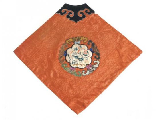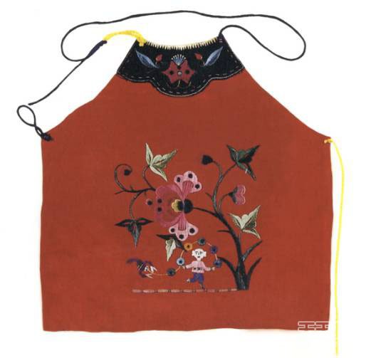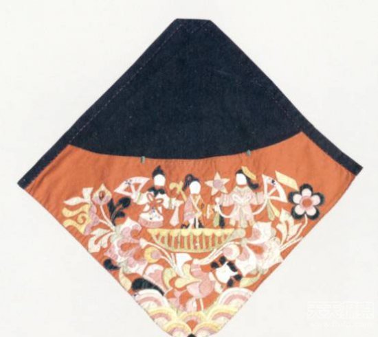 清代。此肚兜菱形,上半黑地,下半部分橘紅色地上貼繡人物花卉紋,圖案精美,做工細緻,是大陸服飾傳世珍寶。