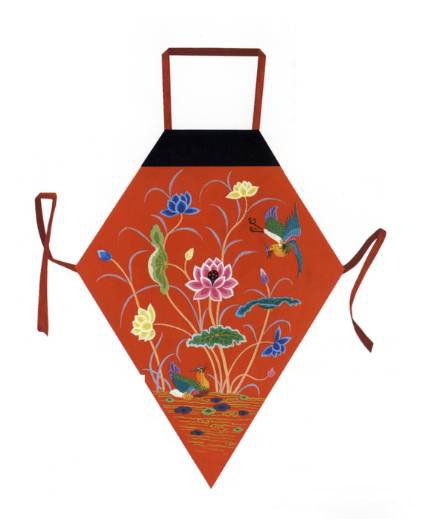紅色的蓮花池肚兜,菱角分明,下方留出尖尖的角,據傳世寶物繪製。