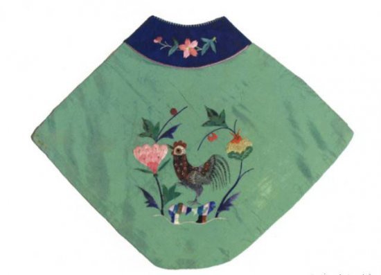 此肚兜為菱形,繡如意紋圓領,下端為尖角,橘紅色地,中間貼繡五福連生貴子紋,寓意吉祥如意、連生貴子。