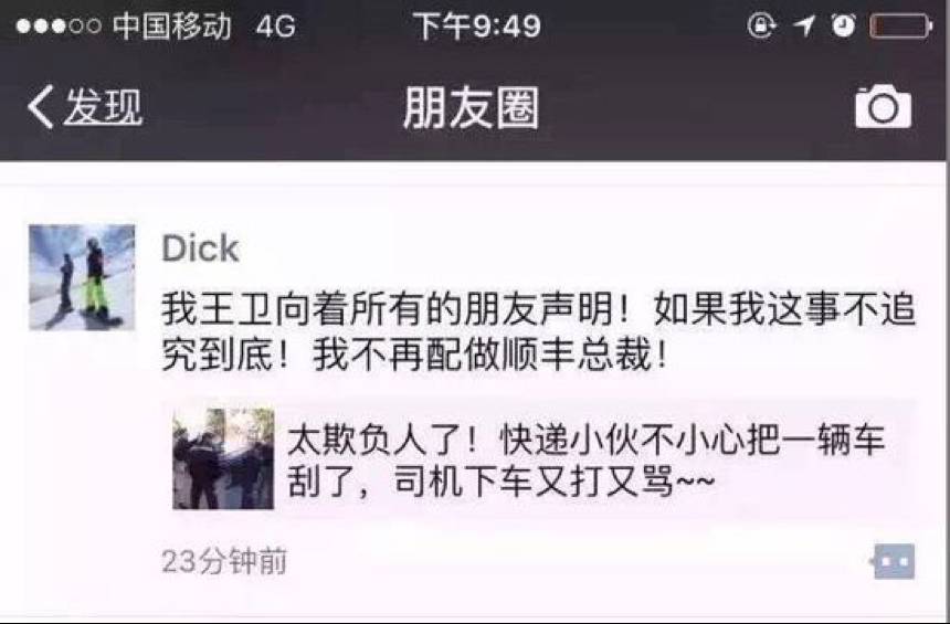 9、王衛很關心一線員工。去(2016)年4月,順豐快遞員與一輛京牌轎車發生剮蹭被打耳光的影片在網上熱傳,王衛在其朋友圈發表聲明,稱『如果這事不追究到底!我不再配做順豐總裁!』今年1月,在順豐年會上,王衛提及一張順豐員工在大雪中吃便當的照片,當場飆淚。王衛表示,每一個快遞員都是順豐這個大家庭的孩子,為什麼我們的孩子會冒著雪吃便當?覺得很對不起大家!