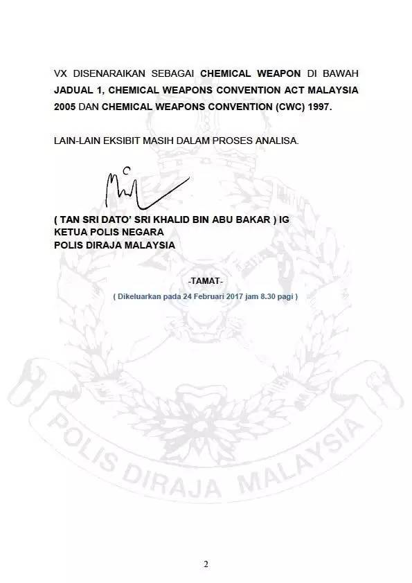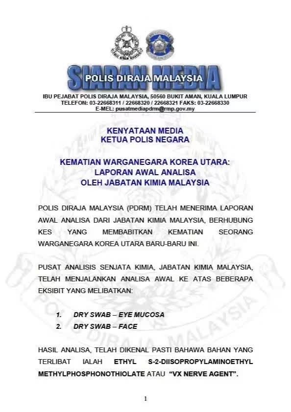 根據央視新聞報導,2月26日上午,馬來西亞警方發表聲明稱,警方已收到初步的屍檢報告,透過對死者眼粘膜和臉部樣本分析,檢測出了一種叫VX的神經毒劑成分。