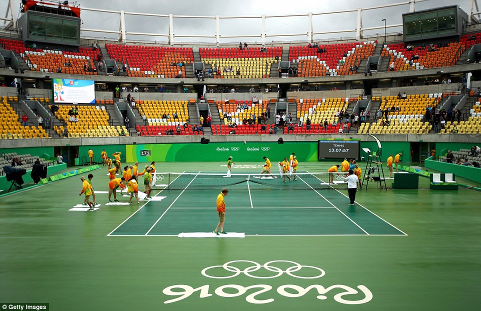 在連續的大雨以後,志願者試圖讓網球館變乾。