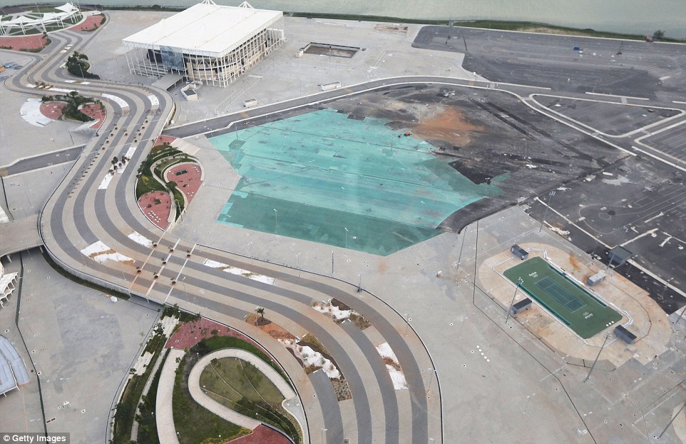 舉世聞名的馬拉卡納體育場,曾經也舉辦過2014年世界杯,現在也被遺棄。水上運動中心的游泳池已經乾了,但是去年夏天這裡讓人印象深刻。圖為網球場(右側)和水上運動館(上方),附近都是有裂痕的道路。
