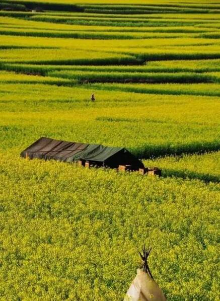 油菜花猶如黃色的花毯、仿佛黃色緞帶,還有些則散落著,像綠色海洋裡的繁星。