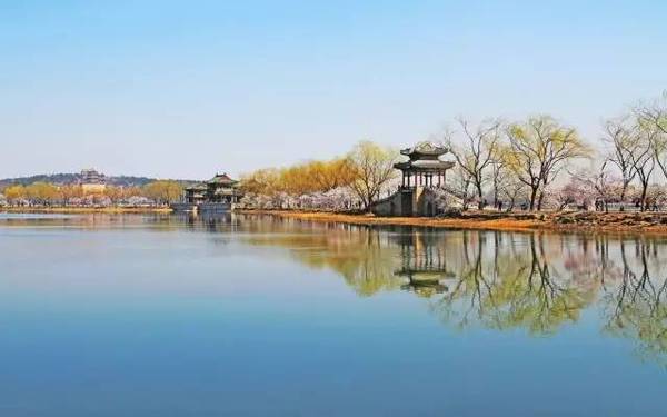 頤和園西堤一帶碧波垂柳,自然景色開闊,西堤的桃花仿佛一夜間競相綻放,昆明湖畔的柳樹冒出了新芽,粉紅色的桃紅與翠綠色的柳芽相應成趣,一眼望去便是滿園的春色。