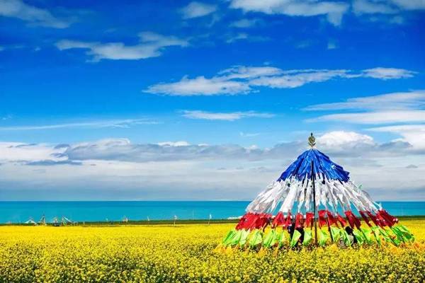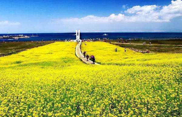 這裡油菜花綻放的背景是青海湖,它著眼於大,水天之際,幾公里綿延不絕。