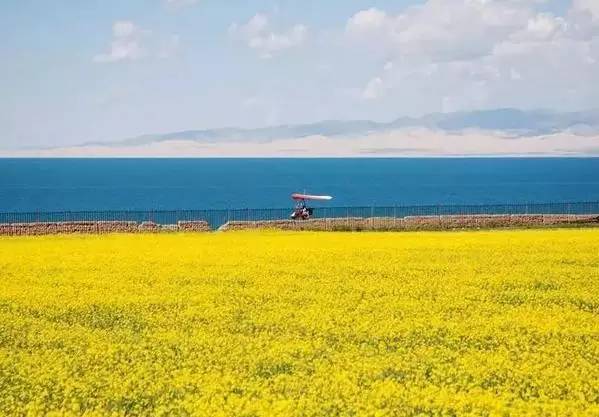 黃色的花海和一望無際的藍色湖水相配襯,在陽光下熠熠生輝,這樣的畫面足以讓任何人心動。