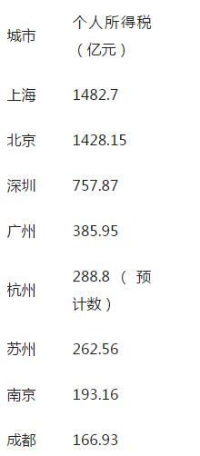需要說明的是,由於部分重點城市的個稅收入資料尚未發布或者不詳,在此只選取部分城市比較。其中,杭州的資料為預計數。