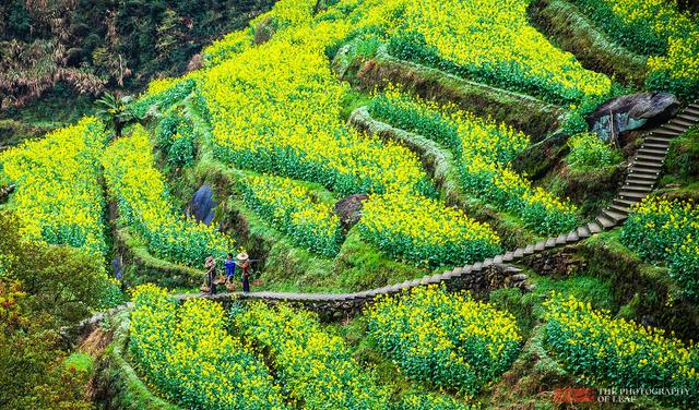 台回山的梯田,一層層如鏈似帶,從山腳盤繞到山頂,蜿蜒的小路散落其中,給人帶來無限的想像。放眼望去,金燦燦的油菜花鋪滿梯田,層巒疊嶂、連綿起伏,十分耀眼。婺源人山人海的喧鬧,開化的美景顯得更加安逸美好。遠離都市的喧囂,在金色的花海中,來一次淨化心靈的旅行。