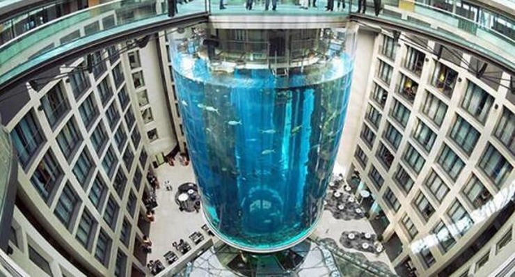 德國柏林的巨型魚缸AquaDom,高25公尺,採用圓柱形設計,內有一部透明電梯。AquaDom耗資大約1280萬歐元,2004年對外開放。 AquaDom直徑大約11公尺,是世界上最大的丙烯酸樹脂玻璃圓柱形魚缸,可裝100萬升水 ,喂養著1500多條魚,來自50個種群。