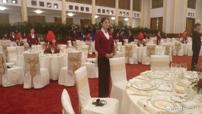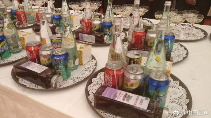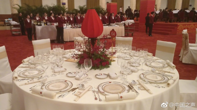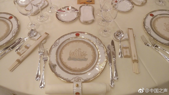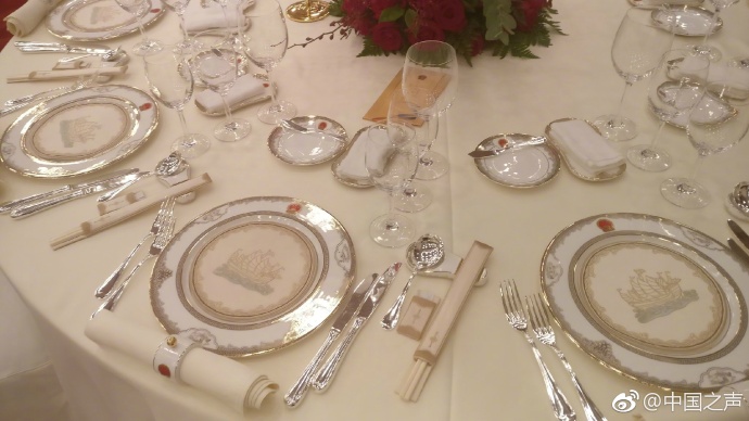 根據鳳凰網報導,記者為你劇透下晚宴的菜單:除了冷盤、點心、水果拼盤,還有四道熱菜,分別是富貴龍蝦、菌香牛肉、香草鱈魚和花好月圓(根據英文的翻譯應該是鴿子蛋和扇貝湯)。酒是中國大陸河北產的乾紅和乾白。