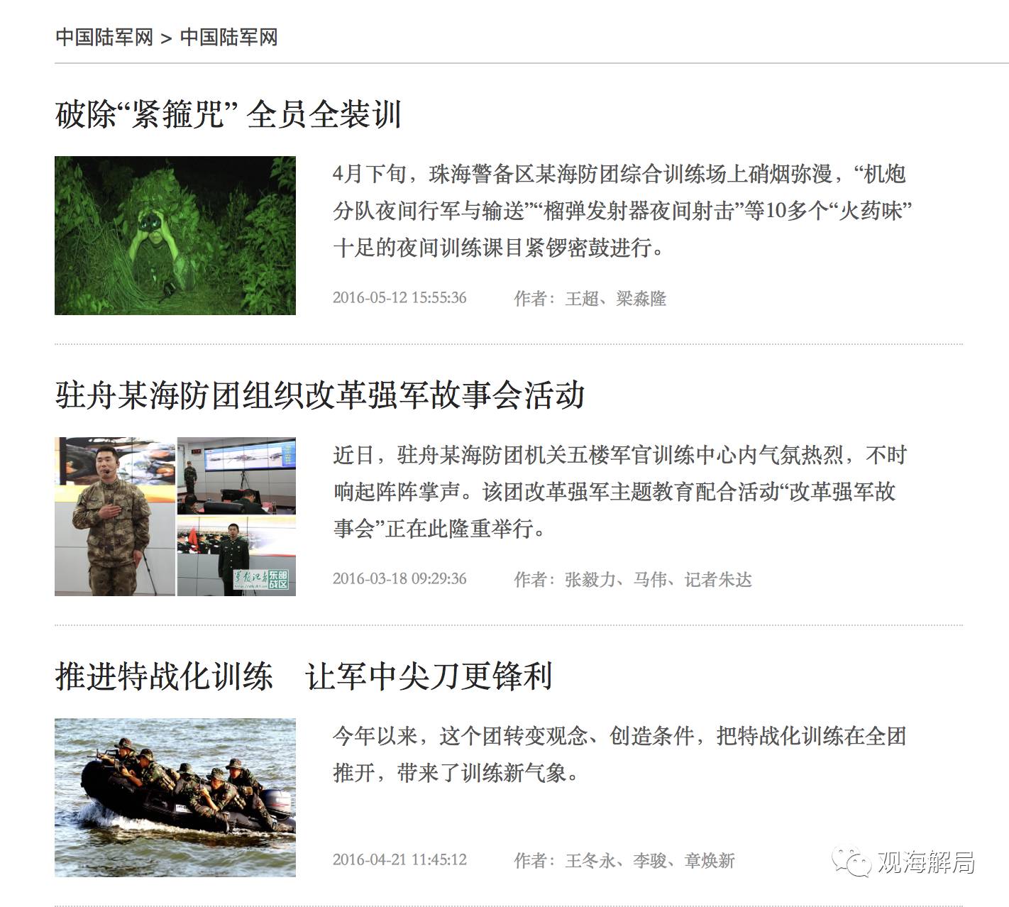 法晚觀海解局記者今日登陸中國陸軍官方網站,發現三支部隊新入駐首頁專欄區域,他們分別是:海防、預備役、試驗部隊。