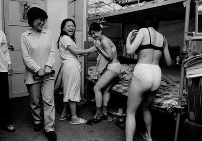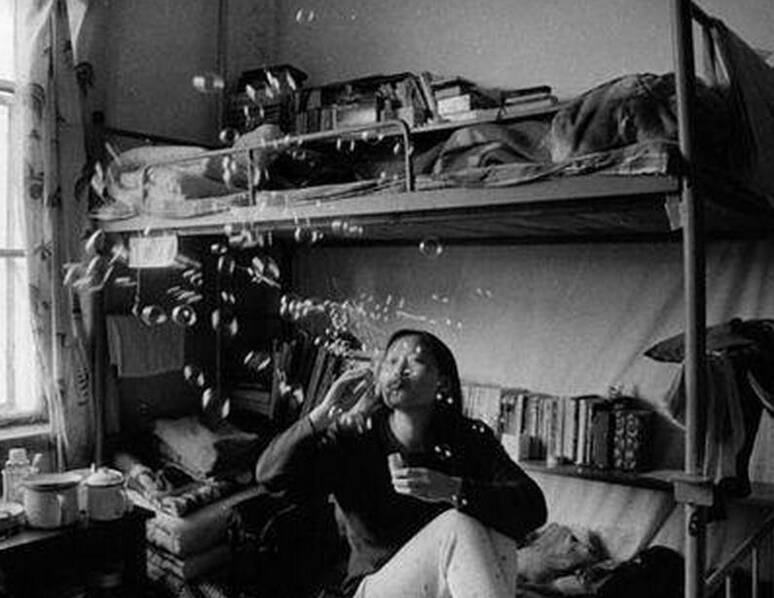 當時的宿舍都是非常簡陋的,都是鐵架上下床,不像現在某些大學都是上床下桌了,以前桌子不夠用,都是堆在床上的,每張床上都有一條書架,她們的娛樂也是非常少的。
