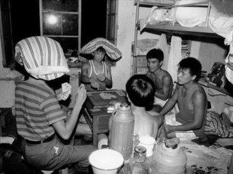 以前每個人都配備這一個熱水瓶,每次都要去水房打水,而夏天宿舍很悶熱,這幾個男生光著膀子在宿舍打牌,這個懲罰方法也是非常有趣。