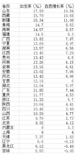 從出生率來看,有14個省份的出生率超過13‰,高於全國12.95‰的平均水平。其中山東以17.89‰的出生率位居各省份第一位。西藏和新疆分列二、三位,都超過了15‰。此外,青海、海南、福建、廣西和寧夏分列四到八位。