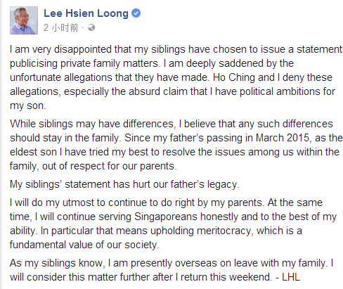 針對兩人的指控,李顯龍全然否認。他說:『兄弟姐妹之間可能存在分歧,我認為這些分歧應該是只限在家庭裡。自從我父親在2015 年3月去世,出於對父母的尊重,身為長子,我盡一切努力處理我們家人之間的紛爭。我弟弟妹妹的公開信傷害了父親的名譽。我會繼續盡我全力無愧於父母,與此同時,也會繼續竭盡所能忠誠的為新加坡服務,特別是堅持唯才是用,而這是我們社會的基本價值觀。我的弟弟妹妹們都知道我和家人在國外度假,這個周末回國後我會考慮後續的處理。』