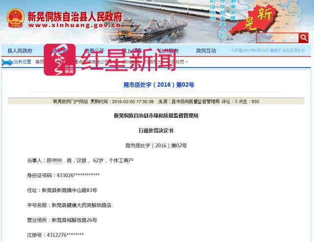 新晃市場和質量監督管理局處罰書截圖。