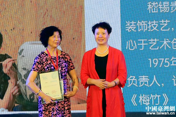 浙江聯合中小企業控股集團董事長周穎為入圍獎獲獎者黃強頒獎,獲獎作品為《奇石方磚套壺》。