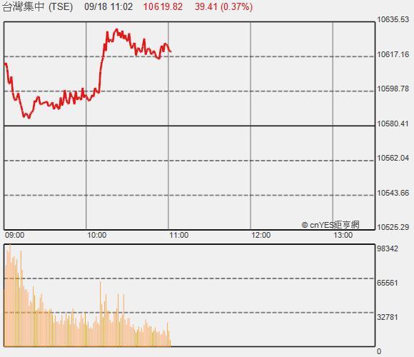 台股上周五 (15 日) 收穩在 10500 點之上,在美股道瓊指數再創新高加持下,多頭信心不墜,加權指數今 (18) 日開盤漲 32.21 點,突破 10600 點關卡,盤中雖一度稍作壓回在 10600 點上下波動,隨後又在亞股整體的拉抬下急拉漲超過 50 點,最高來到 10634 點,預估成交值逾 1400 億元。