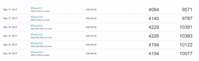 據晶片性能測試工具 GeekBench 數據顯示,單核皆得分為 4000 以上,最高 4274;多核得分則高達 10000 左右,最高 10472;上一代的 A10 晶片,單核成績僅 3332,多核成績為 5558,顯示無論是單核還是多核性能,A11 Bionic 晶片皆明顯飆升。