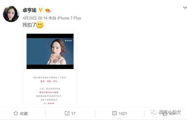 而卓亨瑜發的圖呢?大家看大圖吧~提到了雅詩蘭黛的一款唇膏,和大冪冪代言的不是一個系列,很可能拍攝的是唇膏的試色,但是由於時間節點剛好差不多,難免讓人多想啊!