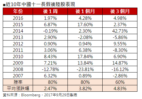 根據 Bloomberg 統計,近 10 年來,十一長假後 1 周、後 1 個月,陸股普遍呈現漲多跌少,勝率都有 8 成,平均漲幅 2.47%、3.82%。若時間拉長至後 3 個月,勝率仍有 6 成,漲幅提高至 4.83%,顯示長假過後市場信心回籠,買盤明顯回流,帶動股市逐步向上。