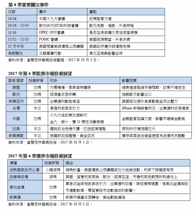 富蘭克林華美投信今 (3) 日發表今年第 4 季投資展望,認為全球股市多頭行情不變,加碼區域包括美國、歐洲與新興亞洲,其中又以美國與新興亞洲最為閃耀,今、明兩年的企業盈餘可望有雙位數成長,是後市看俏的重要依據,可把握短線震盪進場機會。債市部分則傾向高票息收益、低存續期債種的布局建議,以高收益債、新興市場債為主軸。