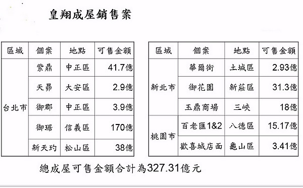 游玉華指出,目前皇翔建設手上成屋金額超過 327.31 億元,包括台北市的紫鼎、天昴、御郡、御琚、新天玓;新台北市華爾街、御花園、玉鼎商場;桃園市的百匯一、二期、歡喜城店面。其中台北市的新天玓建案預計以整棟出售,預估金額為 38 億元。