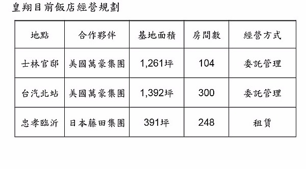 在飯店的布局方面,皇翔最快的是士林官邸一案,士林官邸地上權案基地有 1261 坪,共 104 間房,最快在明年 4、5 月開幕,明年可望貢獻營收,台汽北站預期將會在明年底前取得建照,該案基地有 1392 坪,共 300 間房間,這兩筆個案將委託美國的萬豪酒店管理。另外一案位在忠孝臨沂 (近華山市場),基地面積 391 坪,將出租給日本藤田集團。