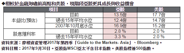 儘管 MSCI 亞太 (不含日本) 指數近期再度攀上 2007 年 11 月金融海嘯來的近 10 年波段高峰,伴隨指數飆揚,也引發市場漲高的疑慮,但許長泰 (Tai Hui) 分析,不同於當時指數受投機資金炒熱而不斷堆高,本益比逼近 17 倍,本波亞股攀新高者主要受惠於強勁企業財報數據,現階段亞股本益比仍相當合理,僅 13.5 倍,較 2007 年仍折價逾兩成,估值回升有望再為亞股增添向上動力。