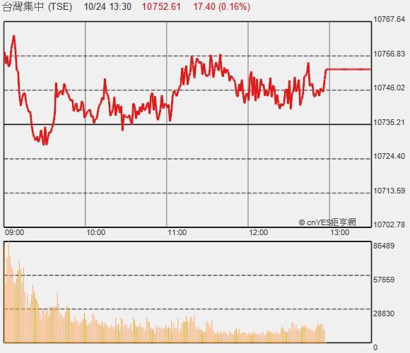 台股今 (24) 日類股輪動,強勢股台積電呈現漲多拉回,但是鴻家軍及二線光學強勢撐盤,加上生技類股也出現反彈,支撐指數橫向整理,終場小漲 8.57 點,以 10743.78 點作收,重回 5 日線之上,成交值 1107.62 億元。