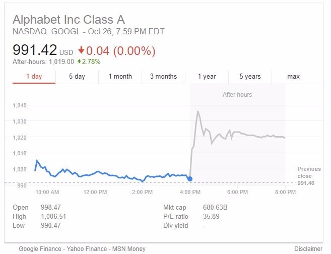 Alphabet 週四表示,第 3 季盈利高於分析師預期,收入也超過預期。股價在盤後交易中漲逾 1020 美元,超越 10 月 18 日盤中高點 1016.31 美元。