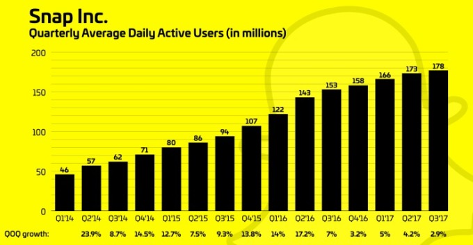 Snap (SNAP-US) 今天在公布未達預期的 2017 年第 3 季財報後股價繼續下滑。Snap 本期僅增加了 450 萬用戶,收入為 2.079 億美元,每股虧損 0.14 美元,而預期收入為 2.37 億美元,每股虧損 0.15 美元。日均用戶 1.78 億,相當於環比 2.9% 的用戶增長率,是有史以來最低的,遠比第 2 季的 4.2% 和第 1 季的 5% 要慢得多。分析師此前預計有 1.8 億用戶。