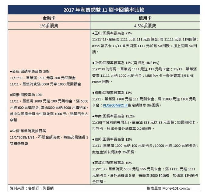 年度網購盛會「雙 11」將在本週六 (11/11) 登場。兩岸電商看準網購龐大商機,紛推促購折扣,其中,不少銀行紛紛攜手淘寶網,推出搶客的刷卡優惠,而淘寶網的支付方式共分為 6 種,Money101.com.tw 建議,今年想趁雙 11 在淘寶網撿便宜,有兩大挑卡重點:一、選擇支付成本低;二、刷卡回饋高。只要能聰明刷卡,最高可以「淘」出回饋率 21% 的高優惠。