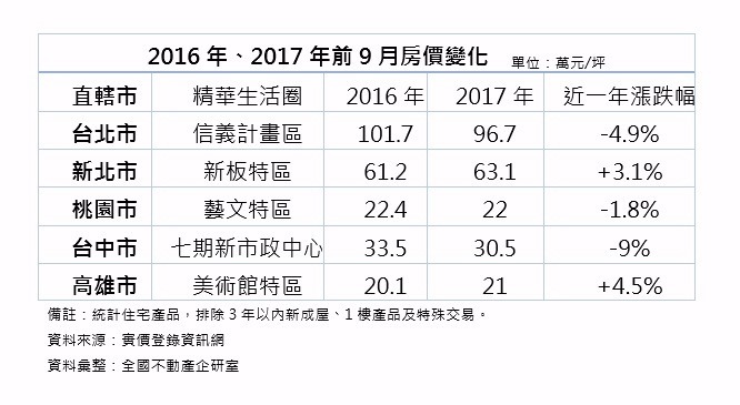房仲業者統計全台五大精華生活區近 2 年實價資料,分析 2016 年及 2017 年前 9 月房價,發現各區漲跌不一,整體而言,南優於北,高雄市美術館特區漲幅約 4.5%,台中七期新市政中心跌勢未止,較去年同期下跌 9% 最重,至於台北市信義計畫區則以跌幅 4.5% 緊追在後。