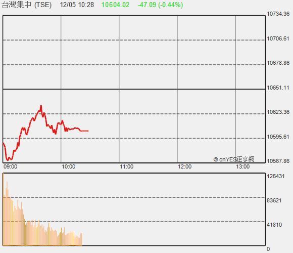 在權值股台積電、鴻海領跌下,電子股今 (5) 日多數走勢疲軟,台股加權指數下跌逾 40 點開出後,最低一度來到 10568 點,回測半年線 10542 點附近支撐,不過,多頭隨即回神並拉回 10600 點,指數呈現多空拉鋸,資金逐漸轉往非電族群,包括塑化、生技、散裝和紡織上游等族群。