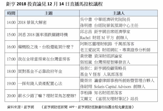 2018 年將至,送走充滿驚喜的 2017 年後,緊接而來是新的一年的挑戰,在進入 2018 年之前,有什麼訊息是投資人不能不知道的,《2018 鉅亨投資論見》將在 12 月 14 日舉行直播馬拉松,邀請 14 位投資專家,從總經、匯率、台股、房市、基金、理財及資產配置做全面向解析,提供投資人滿滿的趨勢洞見。