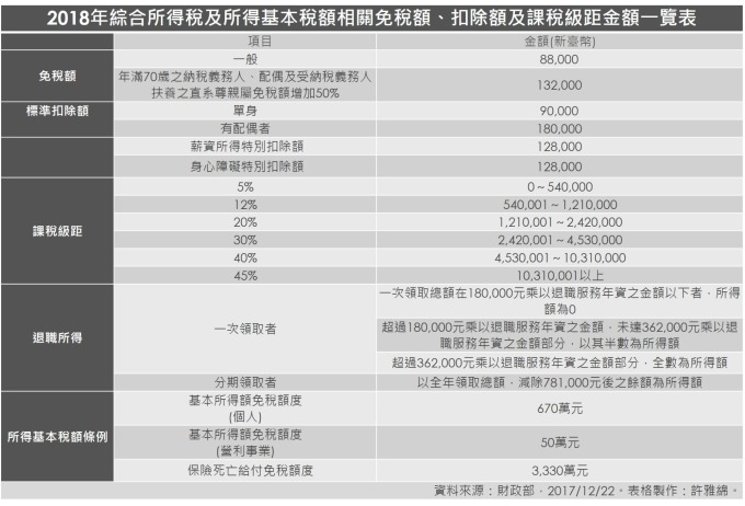 財政部公布,今 (2018) 年所得免稅額、扣除額、課稅級距金額及定額免稅金額等,均維持去年標準。其中,綜所稅免稅額,每人維持減除 8.8 萬元,年滿 70 歲以上者為 13.2 萬元;標準扣除額部分,單身者可減除 9 萬元,有配偶者扣除 18 萬元,薪資特別扣除額、身心障礙特別扣除額則與去年相同為 12.8 萬元。