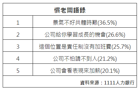 調查統計,上班族遇過慣老闆最瞎的一句話分別是景氣不好共體時艱 (36.5%)、公司給你學習成長的機會 (26.6%)、這個位置是責任制沒有加班費 (25.7%)、以及公司不怕請不到人 (21.2%)、公司會看表現來加薪 (20.1%)。