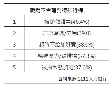 1111 人力銀行今 (15) 日發布「那些老闆教我的事 - 職場厚黑調查 」,根據 1111 人力銀行的調查,有將近 9 成的上班族自認遇過慣老闆,在職場上遭受過主管 / 老闆的不合理對待,最常遇到的不合理對待包括,被拗做雜事 (46.4%)、言語嘲諷 / 辱罵 (39.0%)、超時加班不給加班費 (38.0%)、精神壓力 / 被排擠 (37.3%)、被拗常態加班 (37.0%)。