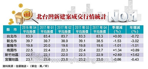 依住展雜誌統計,北台灣各縣市去年第 4 季新成屋、預售屋房價跌多漲少;其中,新北市、基隆與宜蘭地區房價走弱,桃、竹地區逆勢反彈,台北市則開出平盤,但未見反彈趨勢出現,整體房市盤整修正的趨勢依舊未變。