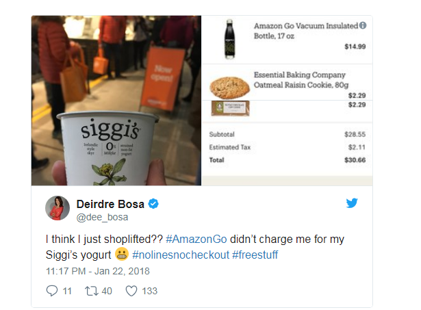 CNBC 科技記者 Deirdre Bosa 就實地走訪一遭,意外發現離開商店後,Amazon Go 結帳項目少了一杯優格 (Siggi’s yogurt)。