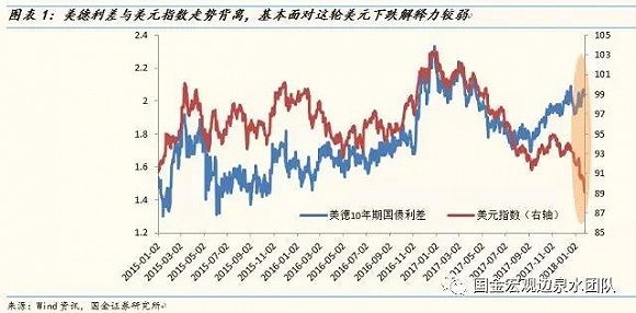 國金宏觀邊泉水團隊今 (29) 日在界面撰文指出,2018 年美元仍將溫和升值,美元指數區間位於 87-95 ,人民幣匯率更多雙向波動,區間在 6.3~6.6 之間。