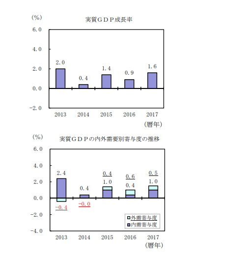 因中美和其他主要經濟體的成長走強,日本出口回彈,有助於日本出口製造業者,且維持失業率低於 3% 水準,但日本工資成長仍落後於預期,縮限了日本家庭和企業提高支出的能力。2017 年,日本內需貢獻 GDP 成長 1.0%、外需貢獻 0.5% 的成長。