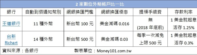至於網銀換匯門檻部分,王道銀為新台幣 100 元,台新 Richart 為新台幣 500 元;網銀換匯優惠,王道銀美金減碼 0.016,台新 Richart 則美金減碼 0.03;提領手續費上,至 2018 年底前,王道銀行無須手續費,台新 Richart 則每季一次減免,減免上限為 500 元。