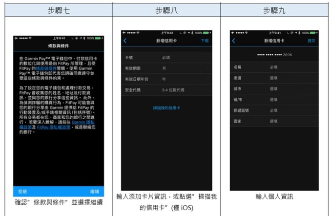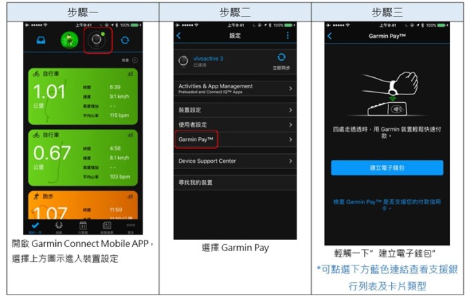 在建立錢包和添加卡片的過程中,Garmin 智慧錶需與手機中的 Garmin Connect Mobile app 連線,Garmin 智慧錶最多可綁定 10 張合作銀行的信用卡。