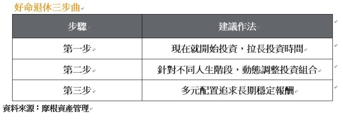 台灣今 (2018) 年正式邁入高齡社會,隨著現代人越來越長壽,民眾的退休生活有很高的機率超過 30 年,因此,專家建議,應該擬定一套適合自己的長期退休規劃,確保退休後的資金可因應生活所需,其中可遵循開始投資行動、動態調整投資組合以及多元配置等理財三步驟。 摩根投信執行董事劉玲君表示,儲備退休金並非難事,擁有快樂第二人生的第一步,就是及早開始準備,透過穩健的投資方式與標的。例如以多重資產策略基金為核心持股,透過基金廣納全球各式股債資產,多元布局,同時掌握收益與資本利得契機,在時間與複利累積下,一步步達成退休資金準備目標。