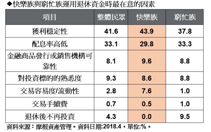 根據摩根投信今 (5) 日公布今 (2018) 年的退休快樂指數調查,針對退休後的固定收益來源,民眾最在意的為獲利穩定性 (41.6%),其次配息率高低 (33.1%),此外,調查也發現,退休快樂指數達 80 分以上的退休快樂族,多數退休後決定持續投資,反觀快樂指數不滿 60 分的退休窮忙族,退休後普遍不再投資。