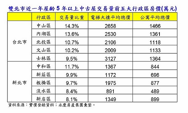 根據實價登錄資料,雙北市各行政區近來 1 年屋齡 5 年以上的中古屋交易量的排序,台北市以中山區交易量最多,其次為內湖及北投區,而新北市則由中和區奪冠,其次為新莊及板橋。