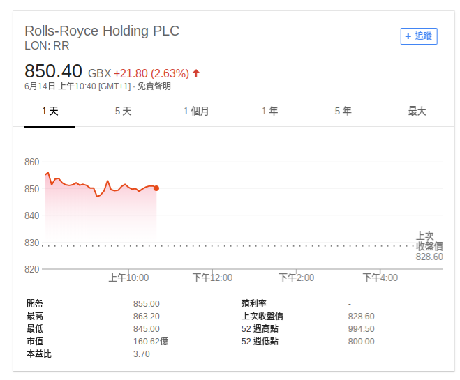 英國勞斯萊斯(Rolls-Royce)集團昨日表示,其開發的特倫特 1000(Trent 1000)引擎出現快速磨損的問題,現在必須全面接受檢查,分析師指出,目前已有超過 30 架飛機因此停飛,而解決相關瑕疵問題的成本可能上看 10 億英鎊。此消息也引起週一股價開盤走跌 1%,後逐漸回升,收盤時收跌 0.31% 至 832.8 英鎊。